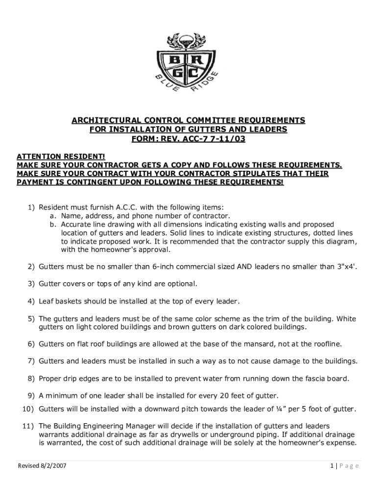 ARCHITECTURAL CONTROL COMMITTEE REQUIREMENTS FOR INSTALLATION OF GUTTERS AND LEADERS FORM: REV. ACC7 711/03 ATTENTION RESIDENT! MAKE SURE YOUR CONTRACTOR GETS A COPY AND FOLLOWS THESE REQUIREMENTS.