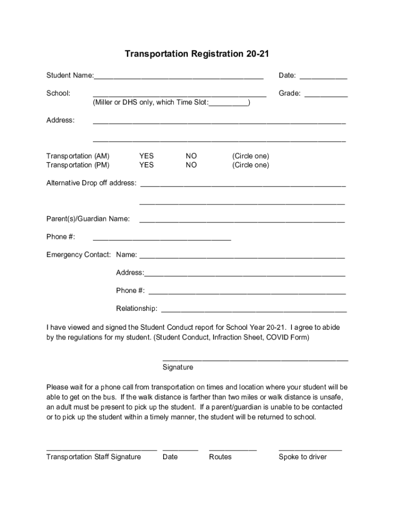 Transportation Registration 2021 Student Name:___Date: ___School:___ (Miller or DHS only, which Time Slot:___)Grade: ___Address:___ ___Transportation (AM) Transportation (PM)YES YES NO NO(Circle one)
