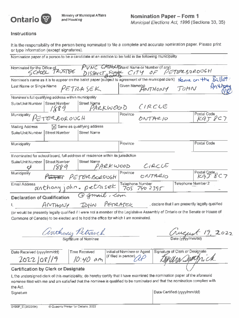 Ministry of Municipal Affairs and HousingontarioQNomination Paper Form I Municipal Elections Act, 1996 (Sections 33, 35)Instructions It is the responsibility of the person being nominated to file