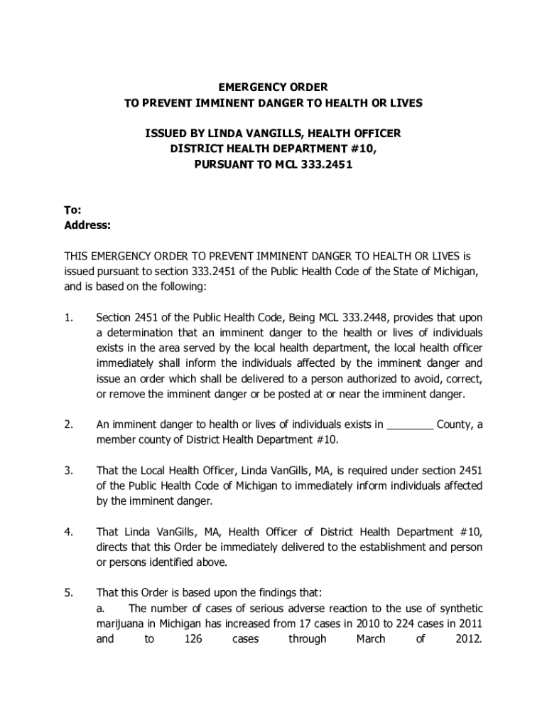 EMERGENCY ORDER TO PREVENT IMMINENT DANGER TO HEALTH OR LIVES ISSUED BY LINDA VANILLA, HEALTH OFFICER DISTRICT HEALTH DEPARTMENT #10, PURSUANT TO MCL 333.2451To: Address: THIS EMERGENCY ORDER TO PREVENT