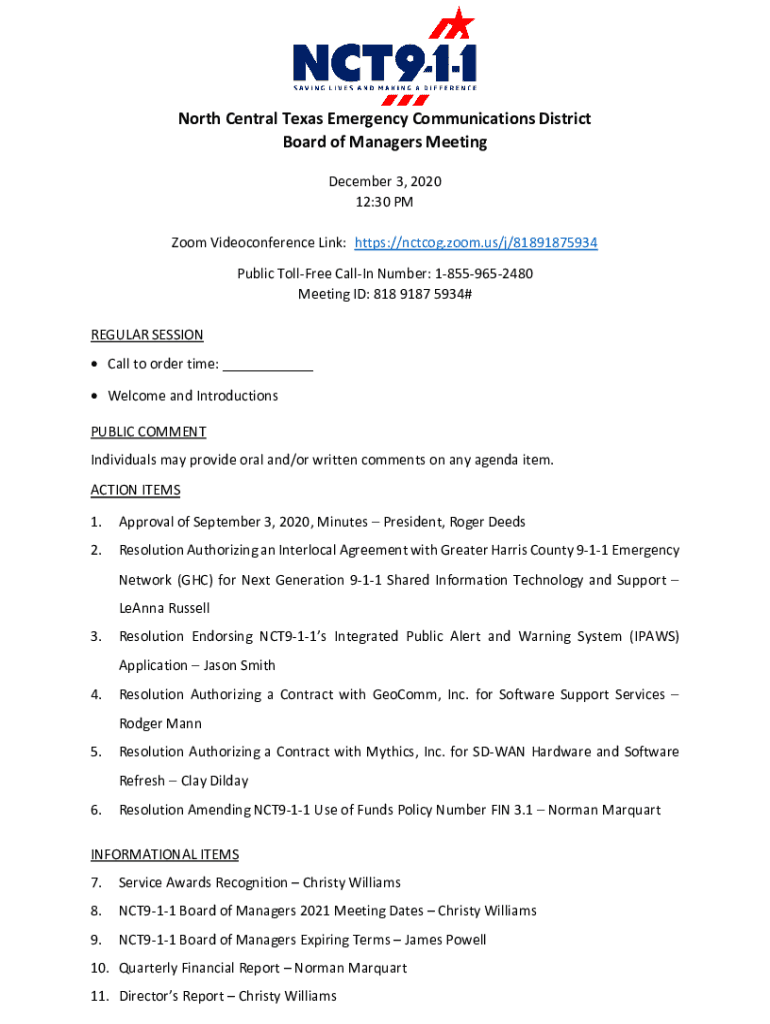 North Central Texas Emergency Communications District Board of Managers Meeting December 3, 2020 12:30 PM Zoom Videoconference Link: https://nctcog.zoom.us/j/81891875934 Public Toll-free Calling Number: