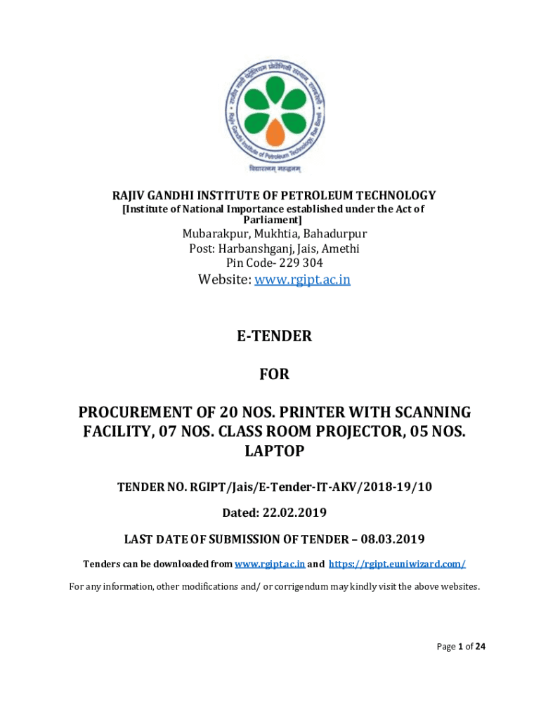 RAJIV GANDHI INSTITUTE OF PETROLEUM TECHNOLOGY [Institute of National Importance established under the Act of Parliament]Mubarak, Multi, Bahawalpur Post: Harbanshganj, Jail, Amati Pin Code 229 304Website: