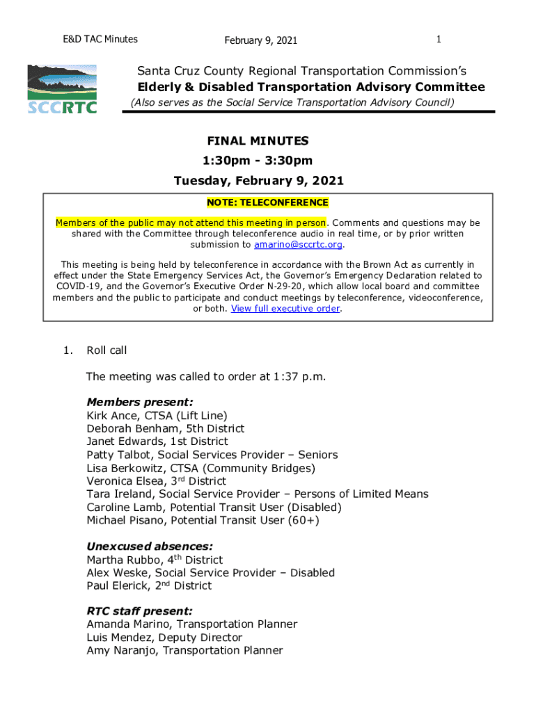 E&D TAC Minutes February 9, 20211Santa Cruz County Regional Transportation Commissions Elderly & Disabled Transportation Advisory Committee (Also serves as the Social Service Transportation Advisory