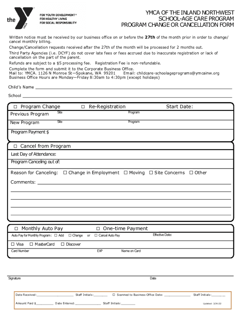 YMCA OF THE INLAND NORTHWEST SCHOOL AGE CARE PROGRAM CHANGE OR CANCELLATION FORM Written notice must be received by our business office on or before the 27th of the month prior in order to change/