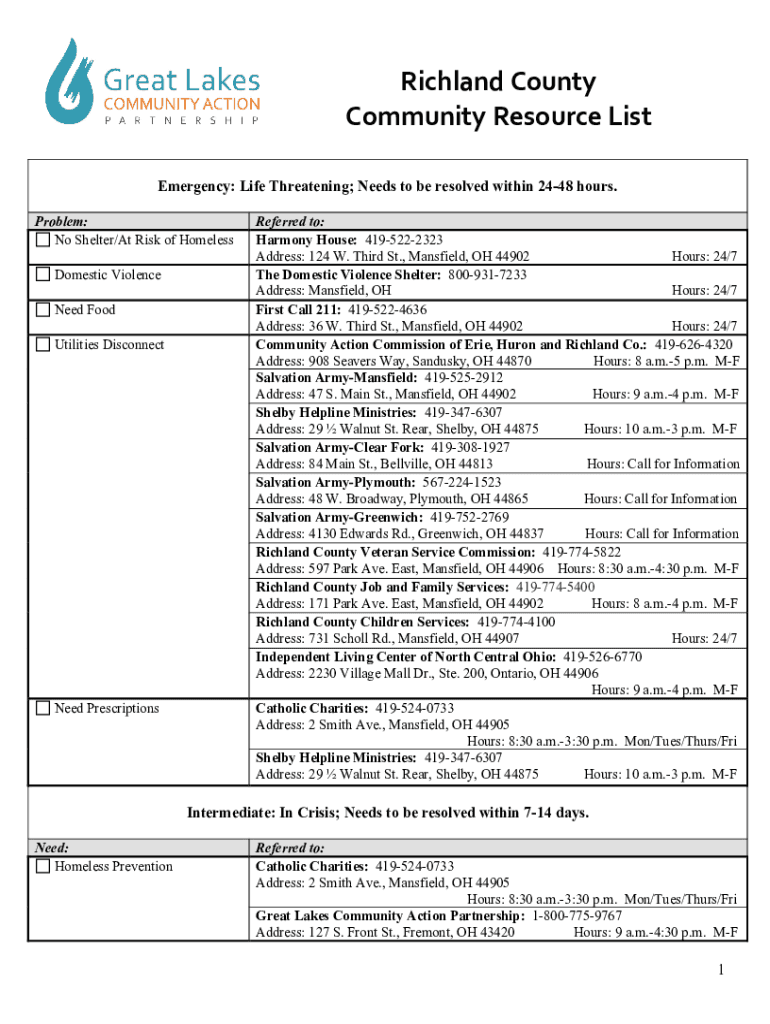 Richland County Community Resource List Emergency: Life Threatening; Needs to be resolved within 2448 hours. Problem: No Shelter/At Risk of Homeless Domestic Violence Need Food Utilities Disconnected