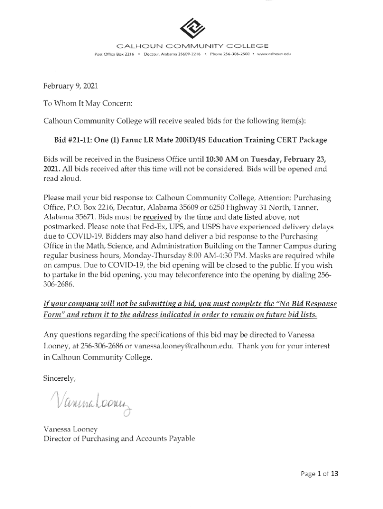 To Whom It May Concern:Calhoun Community College will receive sealed