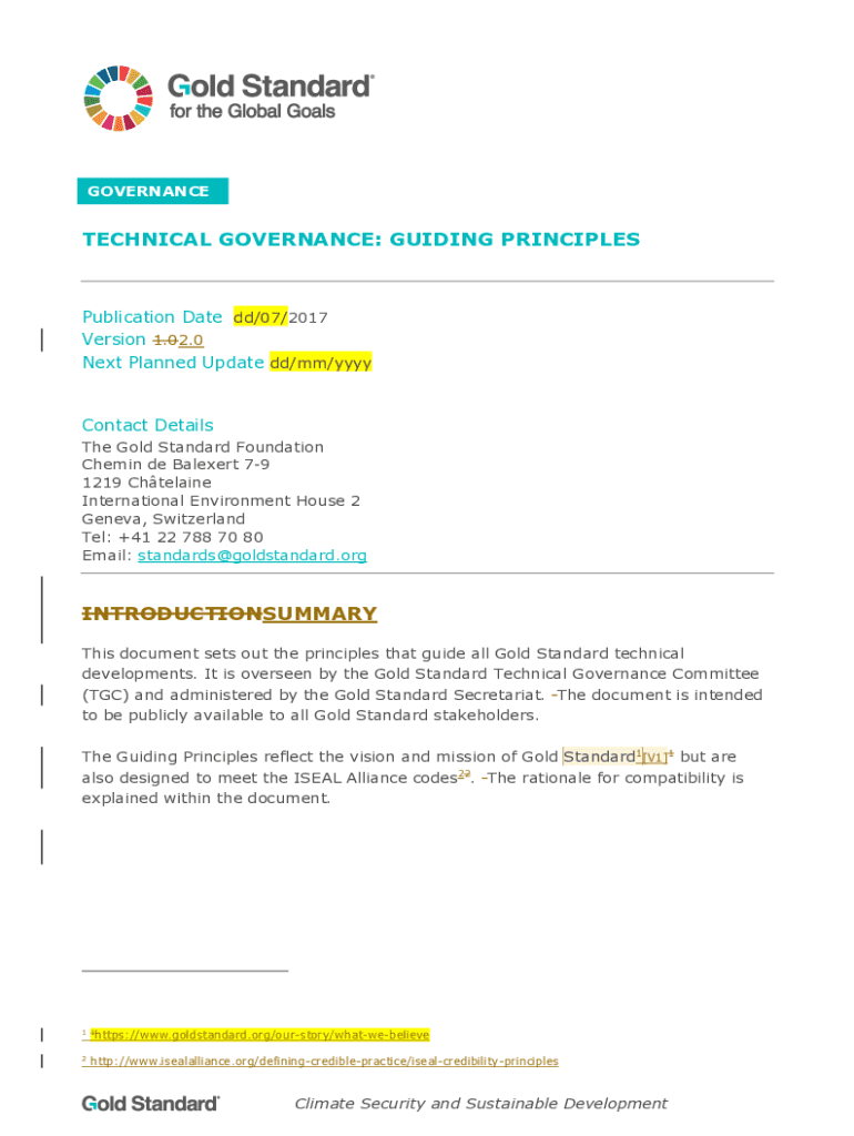 GOVERNANCETECHNICAL GOVERNANCE: GUIDING PRINCIPLESPublication Date dd/07/2017 Version 1.02.0 Next Planned Update dd/mm/yyyyContact Details The Gold Standard Foundation Che min de Albert 79 1219 Chatelaine