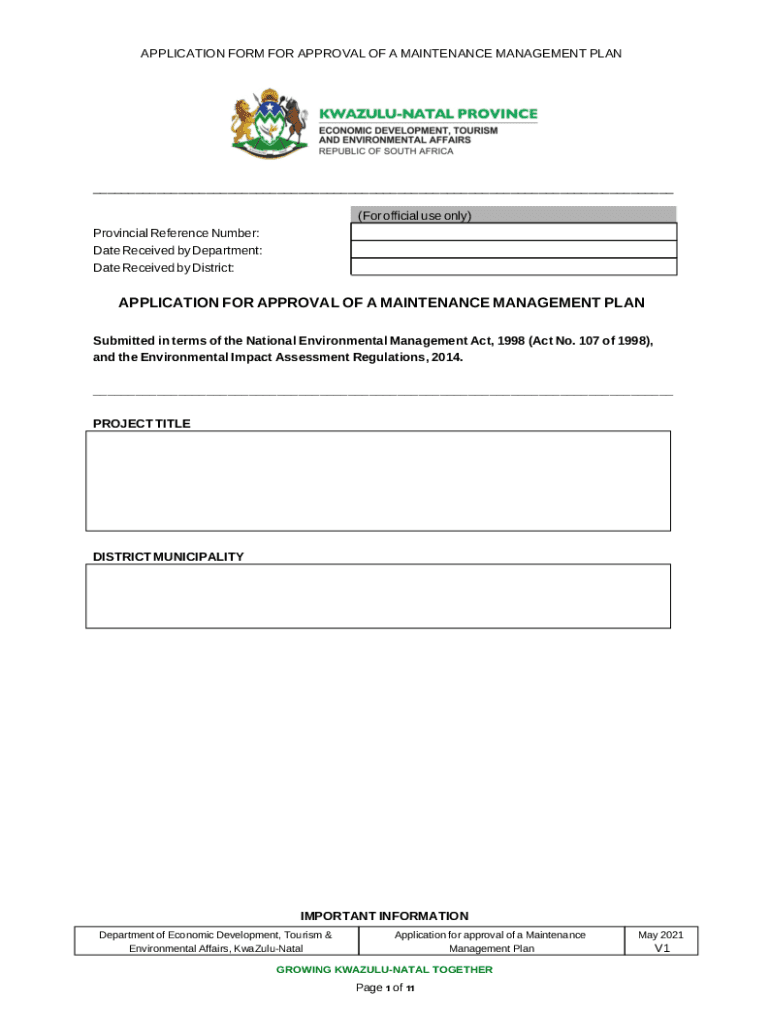 APPLICATION FORM FOR APPROVAL OF A MAINTENANCE MANAGEMENT PLAN___ (For official use only)Provincial Reference Number: Date Received by Department: Date Received by District:APPLICATION FOR APPROVAL