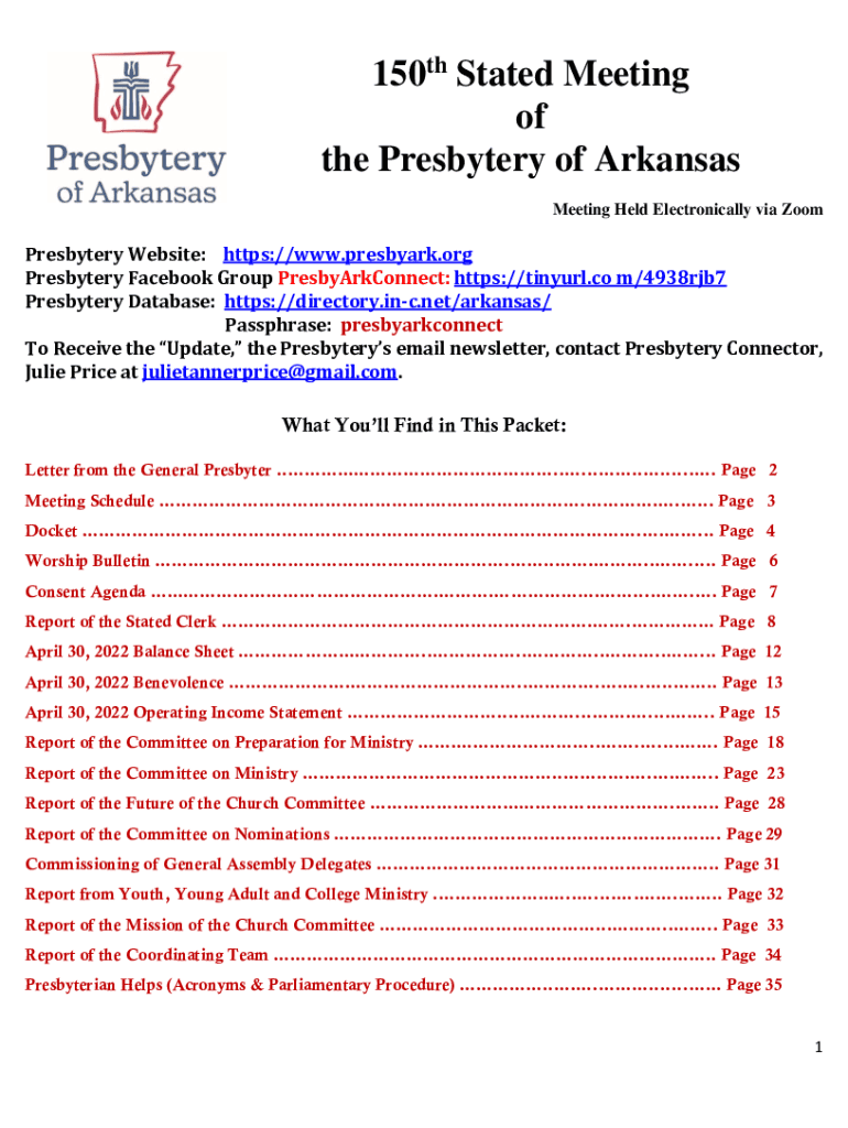 150th Stated Meeting of the Presbytery of Arkansas Meeting Held Electronically via ZoomPresbytery Website: https://www.presbyark.org Presbytery Facebook Group PresbyArkConnect: https://tinyurl.co
