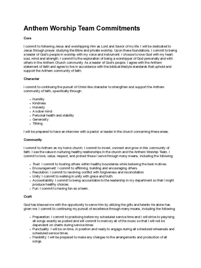 Anthem Worship Team Commitments Core commits to following Jesus and worshiping Him as Lord and Savior of my life. I will be dedicated to Jesus through prayer, studying the Bible and private worship.