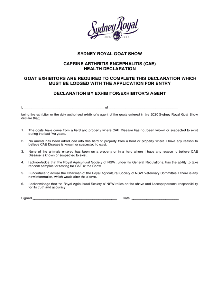 SYDNEY ROYAL GOAT SHOW CAPRINE ARTHRITIS ENCEPHALITIS (CAE) HEALTH DECLARATION GOAT EXHIBITORS ARE REQUIRED TO COMPLETE THIS DECLARATION WHICH MUST BE LODGED WITH THE APPLICATION FOR ENTRY DECLARATION