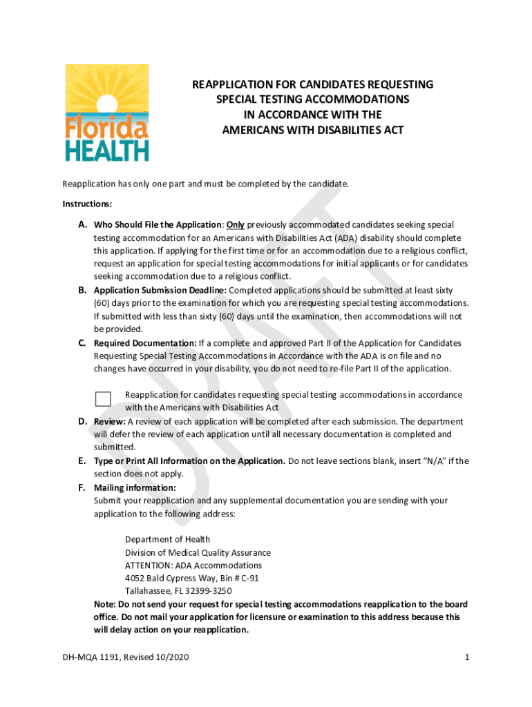REAPPLICATION FOR CANDIDATES REQUESTING SPECIAL TESTING ACCOMMODATIONS IN ACCORDANCE WITH THE AMERICANS WITH DISABILITIES Reapplication has only one part and must be completed by the candidate. Instructions:A.