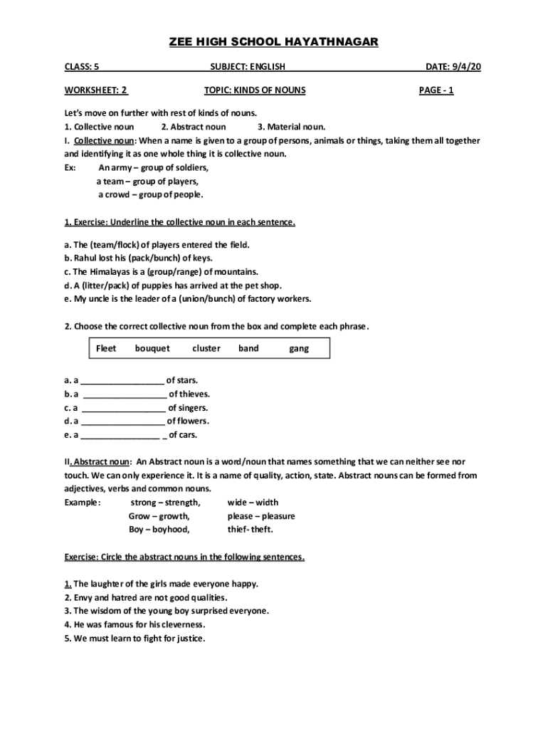 ZEE HIGH SCHOOL HAYATHNAGAR CLASS: 5SUBJECT: ENGLISHWORKSHEET: 2DATE: 9/4/20TOPIC: KINDS OF ONSTAGE 1Lets move on further with rest of kinds of nouns. 1. Collective noun 2. Abstract noun 3. Material