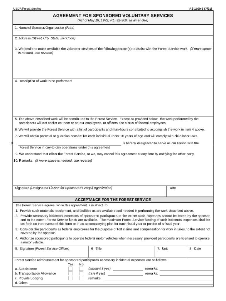 - Search for the FS-1800-8 (5/88). Agreement for Sponsored Voluntary Services from the Search box on the top of the main page.