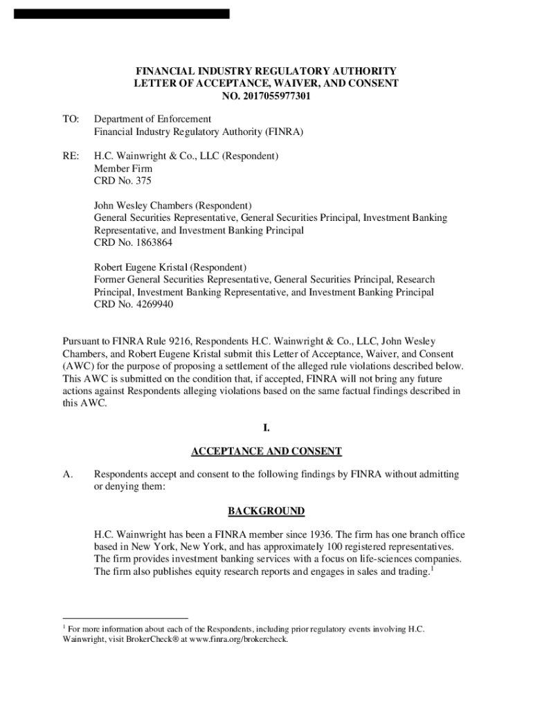 FINANCIAL INDUSTRY REGULATORY AUTHORITY LETTER OF ACCEPTANCE, WAIVER, AND CONSENT NO. 2017055977301 TO:Department of Enforcement Financial Industry Regulatory Authority (FINRA’RE:H.C. Wainwright