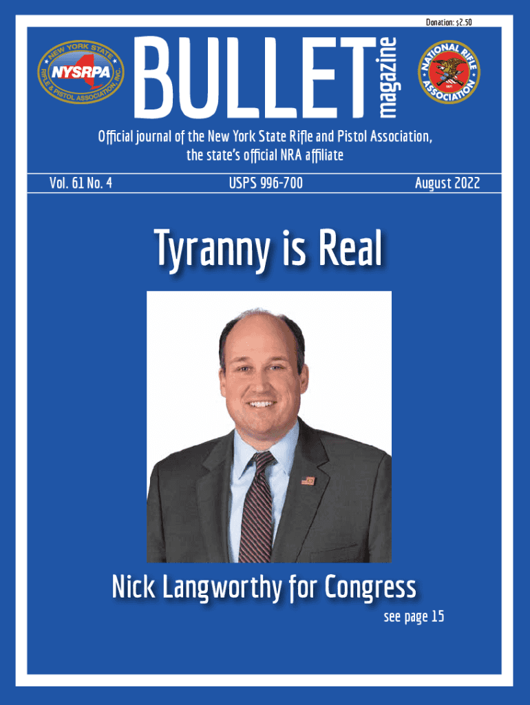 Donation: $2.50Official journal of the New York State Rifle and Pistol Association, the states official NRA affiliate. 61 No. 4USPS 996700August 2022Tyranny is Real Nick Lang worthy for Congress see