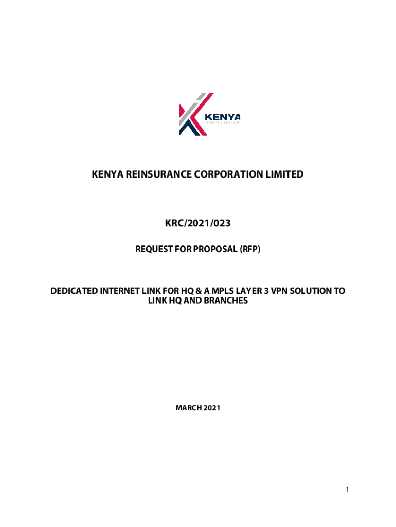 KENYA REINSURANCE CORPORATION LIMITED/2021/023 REQUEST FOR PROPOSAL (RFP)DEDICATED INTERNET LINK FOR HQ & A MPLS LAYER 3 VPN SOLUTION TO LINK HQ AND BRANCHESMARCH 20211Table of Contents1. Invitation