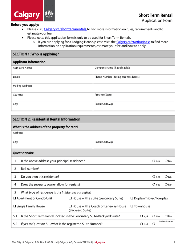 Short Term Rental Application Forbore you apply: Please visit, Calgary.ca/shorttermrentals to find more information on rules, requirements and to estimate your fee Please note, this application form