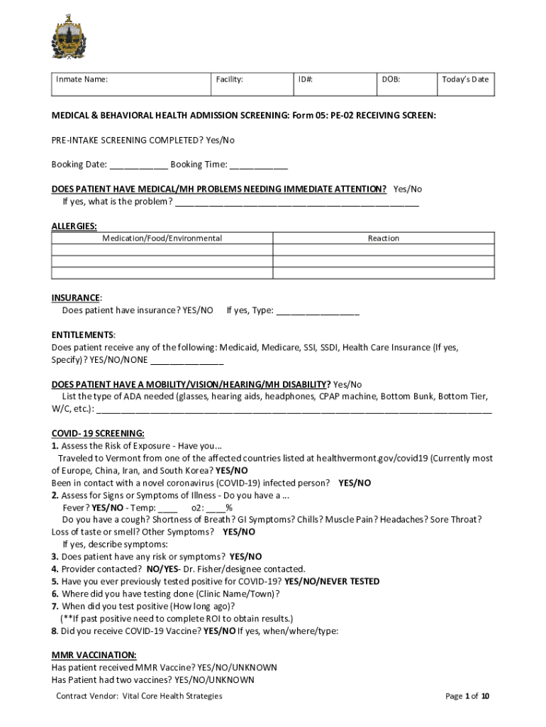 Inmate Name:Facility:ID#:DOB:Today's Paramedical & BEHAVIORAL HEALTH ADMISSION SCREENING: Form 05: PE02 RECEIVING SCREEN: INTAKE SCREENING COMPLETED? Yes/No Booking Date: ___ Booking Time: ___ DOES