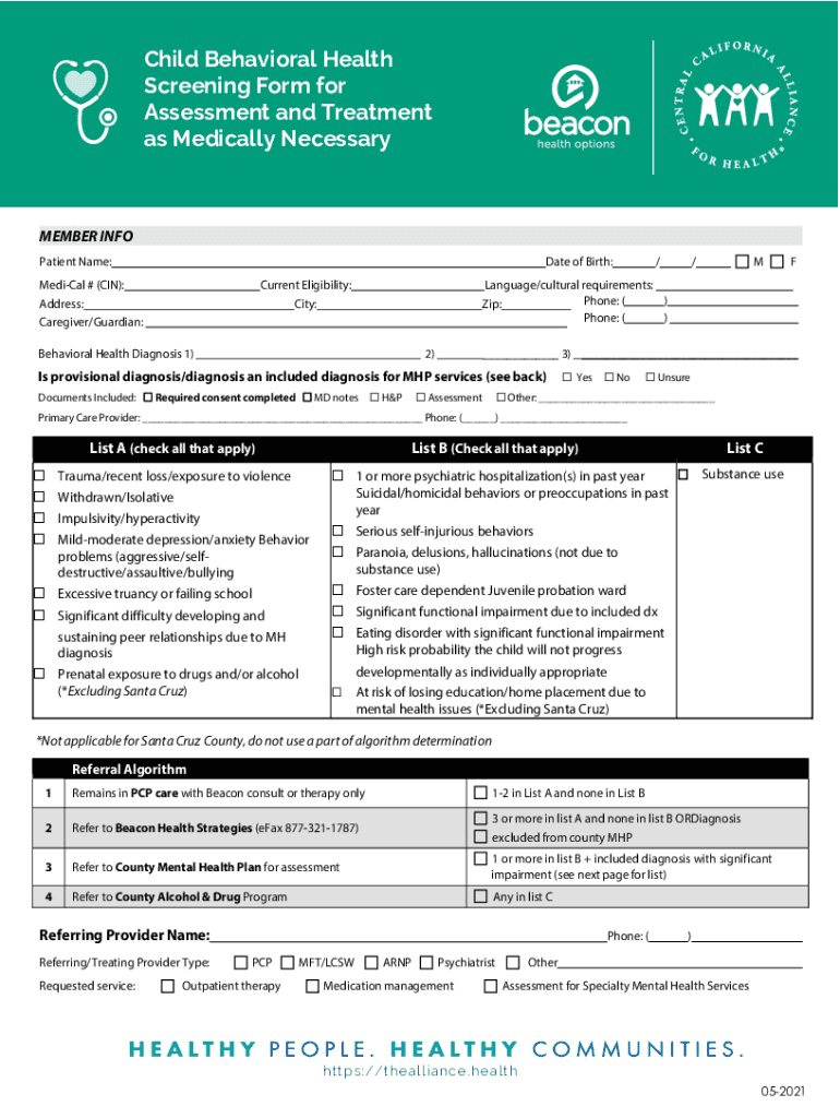 Child Behavioral Health Screening Form for Assessment and Treatment as Medically NecessaryMEMBER INFO Patient Name:Date of Birth:Medical # (IN):Current Eligibility:Address: Caregiver/Guardian://MFLanguage/cultural