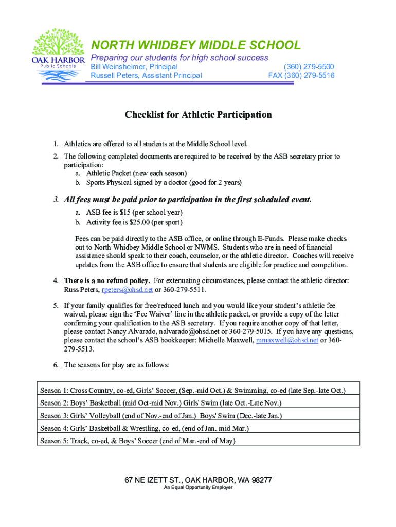 NORTH WHITNEY MIDDLE SCHOOL Preparing our students for high school success Bill Maintainer, Principal Russell Peters, Assistant Principal(360) 2795500 FAX (360) 2795516Checklist for Athletic Participation