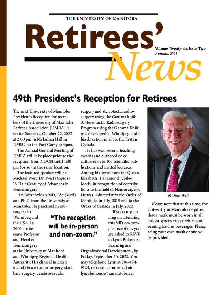 Retirees THE UNIVERSITY OF MANITOBANewsVolume Twenty six, Issue Two Autumn, 202249th Presidents Reception for Retirees The next University of Manitoba Presidents Reception for members of the University