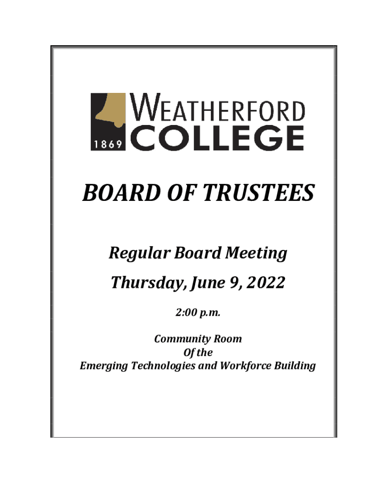 BOARD OF TRUSTEES Regular Board Meeting Thursday, June 9, 2022 2:00 p.m. Community Room Of the Emerging Technologies and Workforce BuildingWEATHERFORD COLLEGE BOARD OF TRUSTEES June 9, 2022 2 p.m.