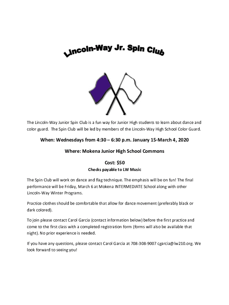 color guard. The Spin Club will be led by members of the Lincoln High School Color Guard. When: Wednesdays
