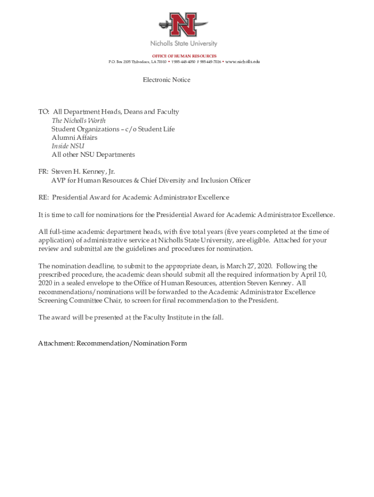 OFFICE OF HUMAN RESOURCES P.O. Box 2105 Thibaut, LA 70310 T 9854484050 F 9854497026 www.nicholls.eduElectronic Notice TO: All Department Heads, Deans and Faculty The Nicholls Worth Student Organizations