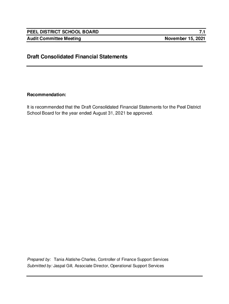 PEEL DISTRICT SCHOOL BOARD Audit Committee Meeting7.1 November 15, 2021Draft Consolidated Financial StatementsRecommendation: It is recommended that the Draft Consolidated Financial Statements for