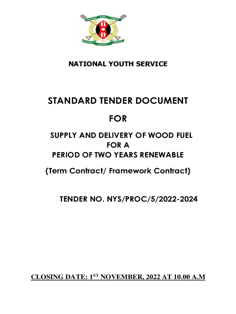 NATIONAL YOUTH SERVICESTANDARD TENDER DOCUMENT FOR SUPPLY AND DELIVERY OF WOOD FUEL FOR A PERIOD OF TWO YEARS RENEWABLE (Term Contract/ Framework Contract)TENDER NO. NYS/PRO/5/20222024 Issued on 22nd