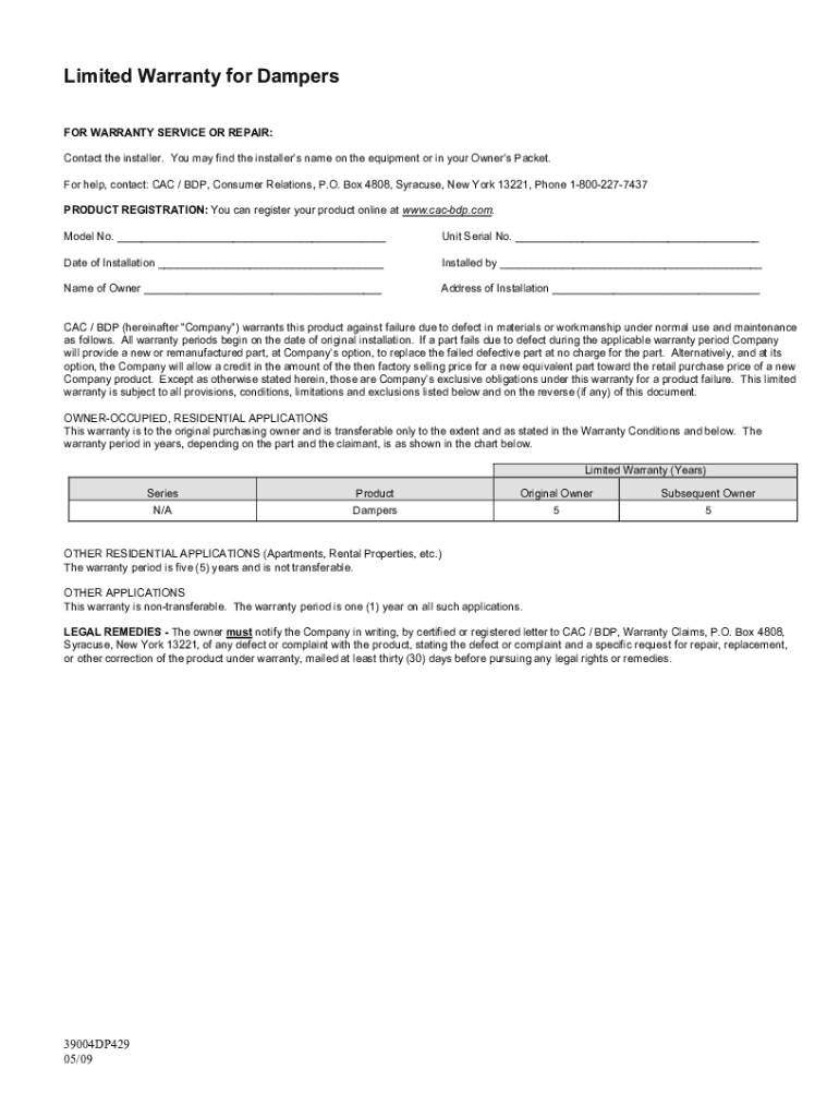 Limited Warranty for Dampers FOR WARRANTY SERVICE OR REPAIR: Contact the installer. You may find the installers name on the equipment or in your Owners Packet. For help, contact: CAC / BDP, Consumer