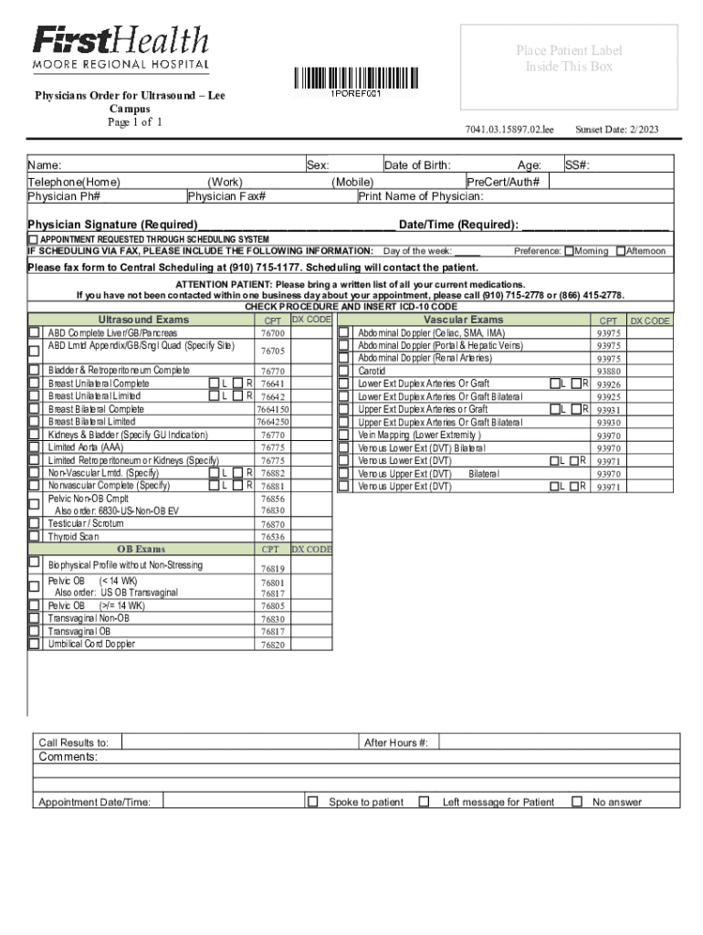 Place Patient Label Inside This Box Physicians Order for Ultrasound Lee Campus Page 1 of 1 Name: Telephone(Home) Physician pH#7041.03.15897.02.lesser: (Work) Physician Fax#Sunset Date: 2/2023Date