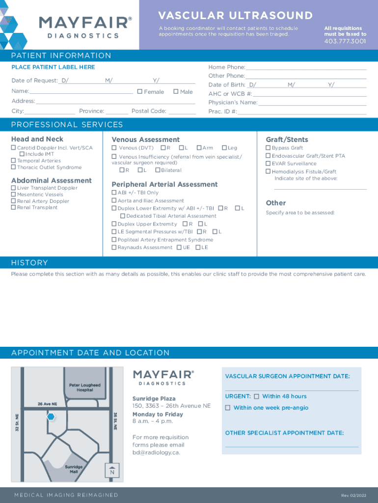 VASCULAR ULTRASOUND A booking coordinator will contact patients to schedule appointments once the requisition has been triaged. All requisitions must be faxed to403.777.3001PATIENT INFORMATION Home