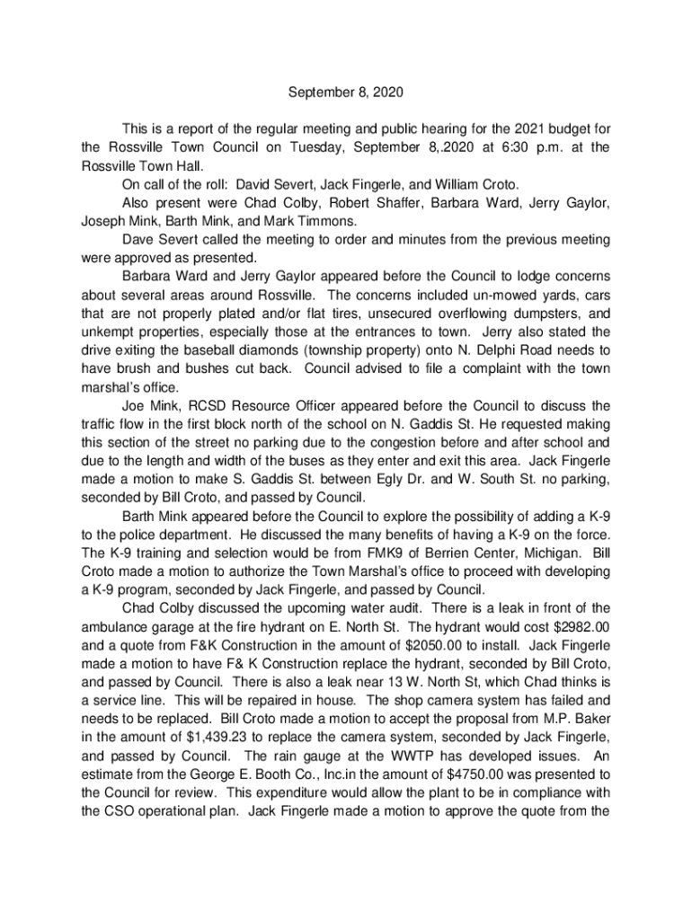 September 8, 2020, This is a report of the regular meeting and public hearing for the 2021 budget for the Roseville Town Council on Tuesday, September 8,.2020 at 6:30 p.m. at the Roseville Town Hall.