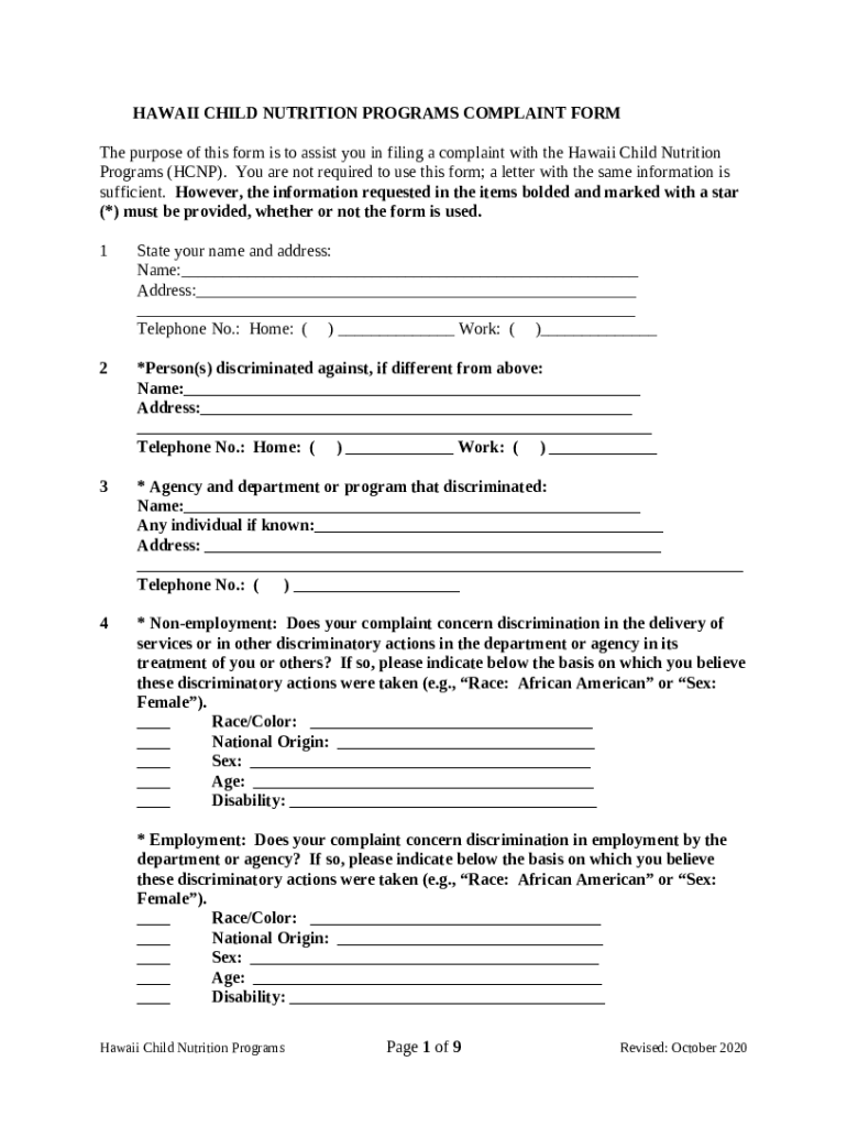 Instructions for the form SAMPLE COMPLAINT - Hawaii Child Nutrition Programs