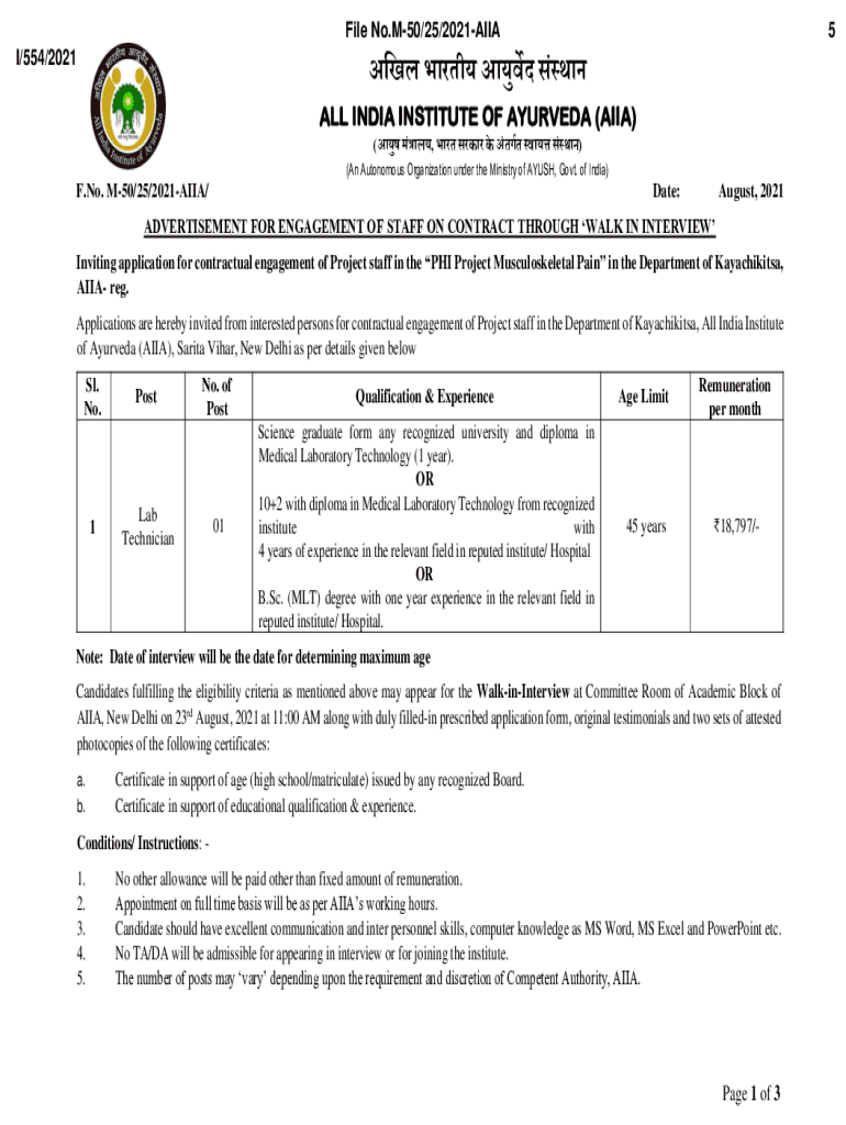 File No. M50/25/2021AIIA I/554/20215 ALL INDIA INSTITUTE OF AYURVEDA (ASIA) (, ) (An Autonomous Organization under the Ministry of AYUSH, Govt. of India)F. No. M50/25/2021AIIA/Date:August, 2021ADVERTISEMENT