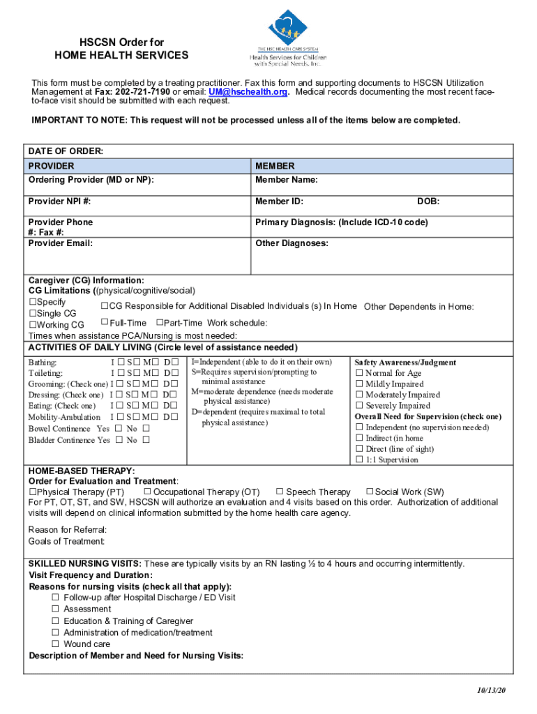 To fill out hscsn order for home, the healthcare provider or physician must provide detailed information about the individual's medical condition and the type of home care services needed.