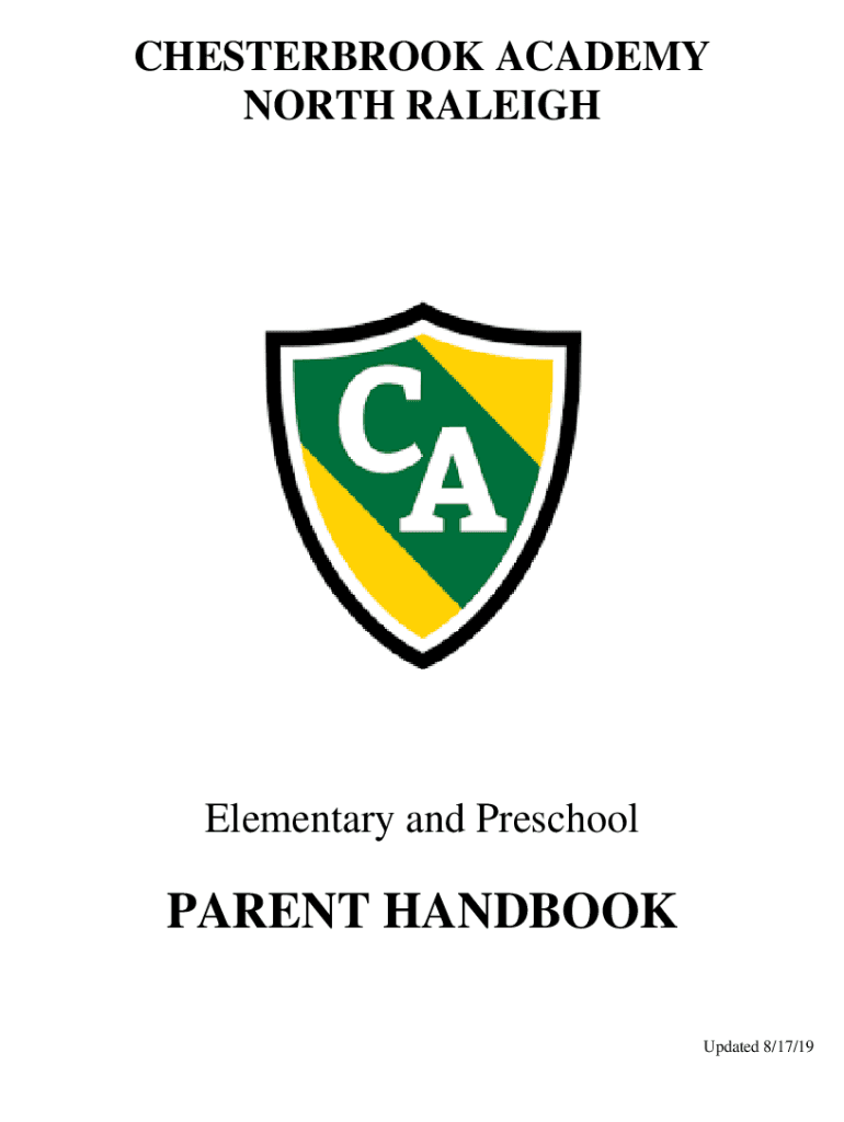 CHESTERBROOK ACADEMY NORTH RALEIGHElementary and PreschoolPARENT HANDBOOK Updated 8/17/19MISSION STATEMENT Within a nurturing safe environment, Chester brook Academy, in partnership with our students,