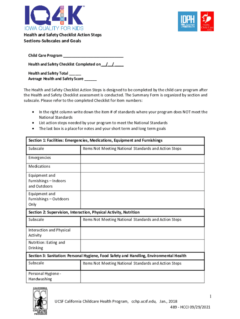 Health and Safety Checklist Action Steps SectionsSubscales and Goals Child Care Program ___ Health and Safety Checklist Completed on __/__/ ___ Health and Safety Total ___ Average Health and Safety
