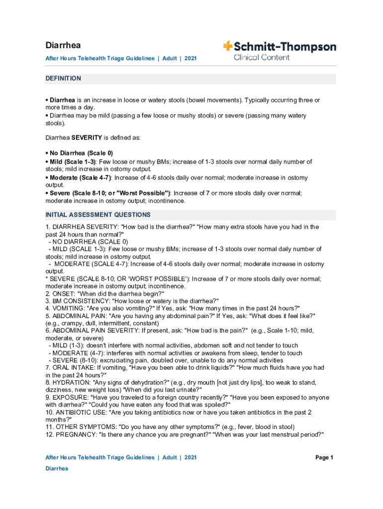 Diarrhea After Hours Telehealth Triage Guidelines | Adult | 2021DEFINITION Diarrhea is an increase in loose or watery stools (bowel movements). Typically, occurring three or more times a day. Diarrhea