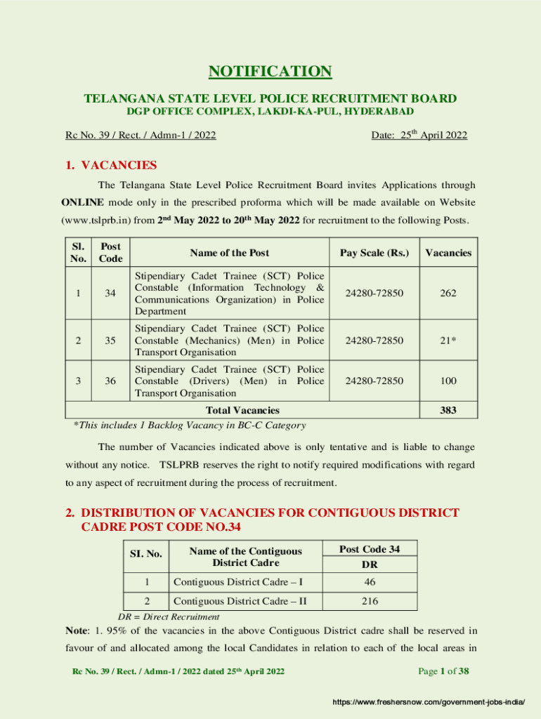 NOTIFICATION TELANGANA STATE LEVEL POLICE RECRUITMENT BOARD DGP OFFICE COMPLEX, LAKDIKAPUL, HYDERABAD Date: 25th April 2022Rc No. 39 / Rest. / Admn1 / 20221. VACANCIES The Telangana State Level Police