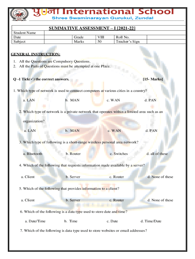 SUMMATIVE ASSESSMENT I [202122] Student Name Date SubjectGrade Markovic 50Roll No. Teachers SignGENERAL INSTRUCTION: 1. All the Questions are Compulsory Questions. 2. All the Parts of Questions must