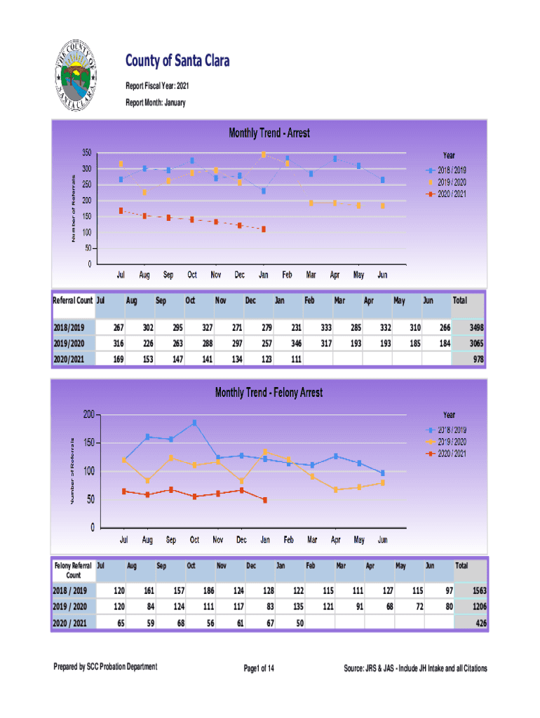 County of Santa Clara Report Fiscal Year: 2021 Report Month: JanuaryReferral Count JulAugSepOctNovDecJanFebMarAprMayJunTotal2018/201926730229532727127923133328533231026634982019/202031622626328829725734631719319318518430652020/2021169153147141134123111Felony