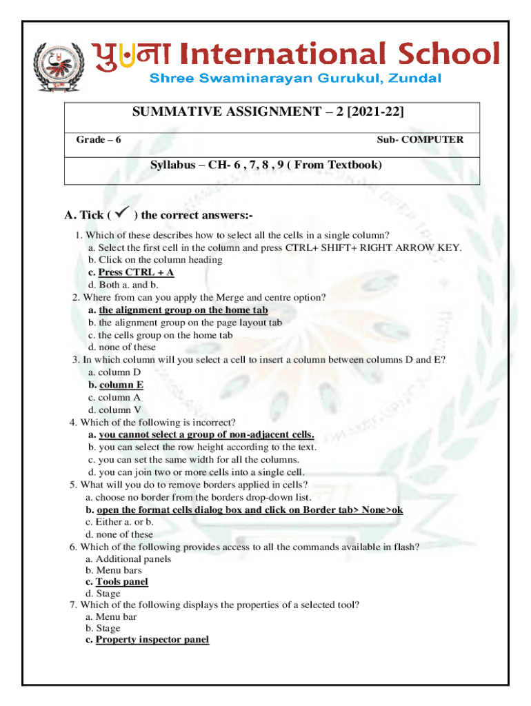 SUMMATIVE ASSIGNMENT 2 [202122] Grade 6Sub COMPUTERSyllabus CH 6, 7, 8, 9 (From Textbook)A. Tick () the correct answers:1. Which of these describes how to select all the cells in a single column?