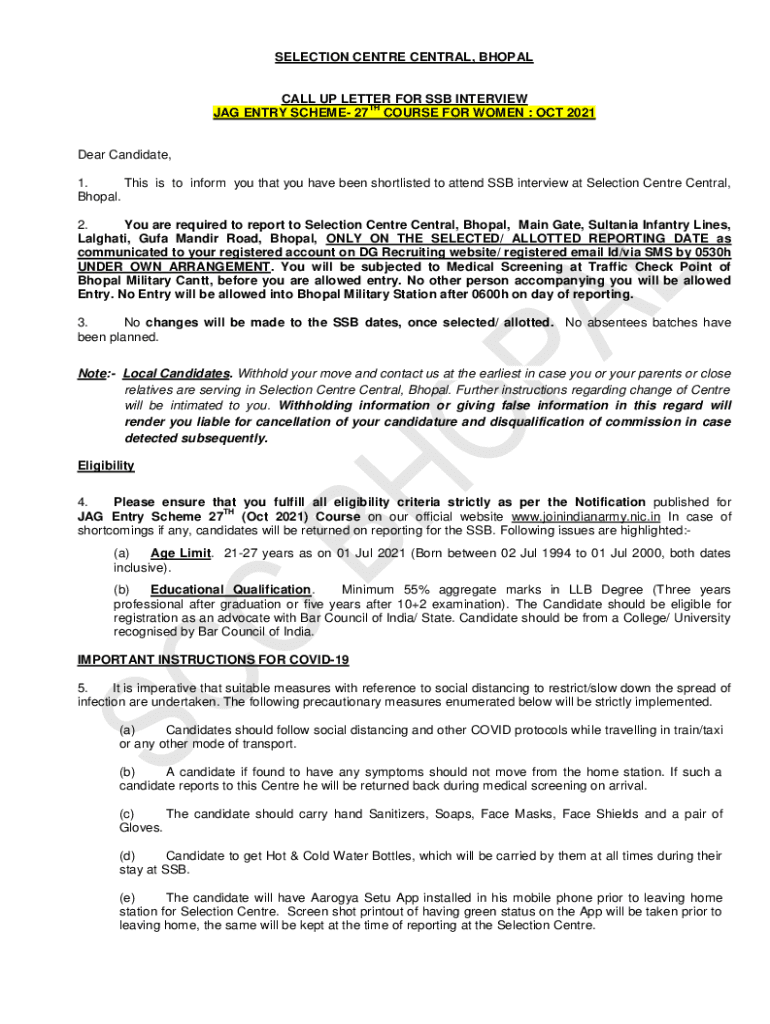 SELECTION Center CENTRAL, BHOPALCALL UP LETTER FOR SSB INTERVIEW