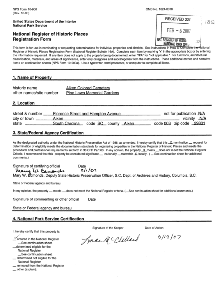 OMB No. 10240018NPSForm 10900 (Rev. 1090)RECEIVED 22tUnited Slates Department of the Interior National Park Service ISO.FEB 5 2007National Register of Historic Places Registration FormmwinwKSftviThis
