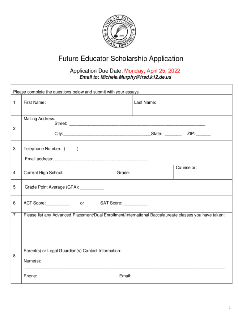 IRS Future Educator Scholarship Transforming today\'s students into tomorrow\'s teachers Indian River School District is offering two $2500 scholarships to Teacher Academy Pathway seniors! This scholarship