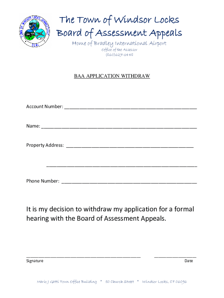 The Town of Windsor Locks Board of Assessment Appeals Home of Bradley International Airport Office of the Assessor (860)6271448 BAA APPLICATION WITHDRAW AccountNumber:___ Name:___ PropertyAddress:___