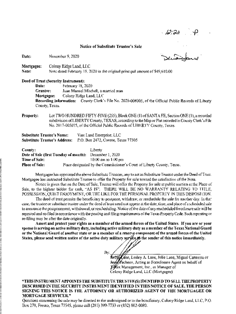 Notice of Substitute Trustee\'s Sale Date:November 9,2020Mortgagee: Note:Colony Ridge Land, LLC Note dated February 18, 2020, in the original principal amount of $49,610.00Deed of Trust (Security